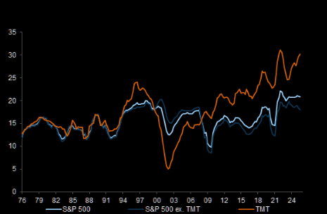 Yes we have some outflows and we have a lot of bubble talk but never forget that US TMT stocks are more profitable compared to the Tech Bubble and the rest of the market. Chart shows return on equity (ROE, %).