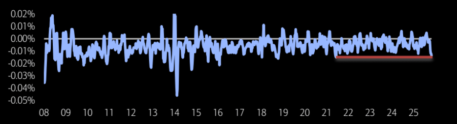 Tech saw the biggest outflow in over 4 years. Here measured as rolling 4-wk avg. Tech ETF flows as a % of Tech mkt. cap.