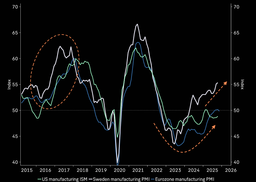 Early signs of cycle bottoming. Chart shows Manufacturing PMI indices.