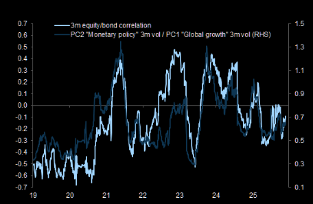 GS: "Equity/bond correlations turned more negative recently as markets shifted to a 'central bank put' regime." Chart shows S&P 500 vs. US 10-year bonds.