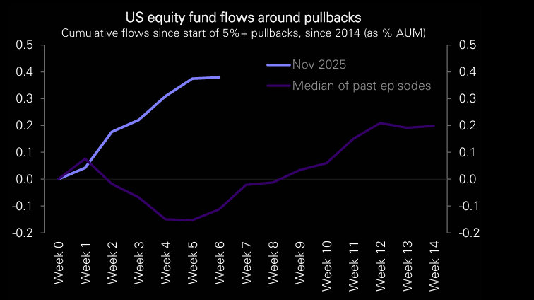 "The equity inflows boom continued through the November pullback, in sharp contrast to past pullbacks which typically saw outflows. This week however saw inflows continue but slow sharply." (EPFR)