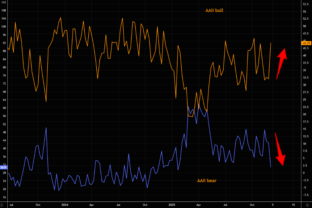 "AAII bull getting very bullish, and bears throwing in the towel, "printing" close to lowest levels of the year." (TME - sorry for obnoxiously quoting ourselves)