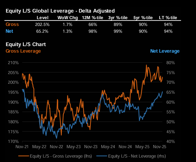 "Among Eq L/S funds, gross and net both ticked up 1-2% and are at the 90th %-tile on a 5yr basis." (JPM)