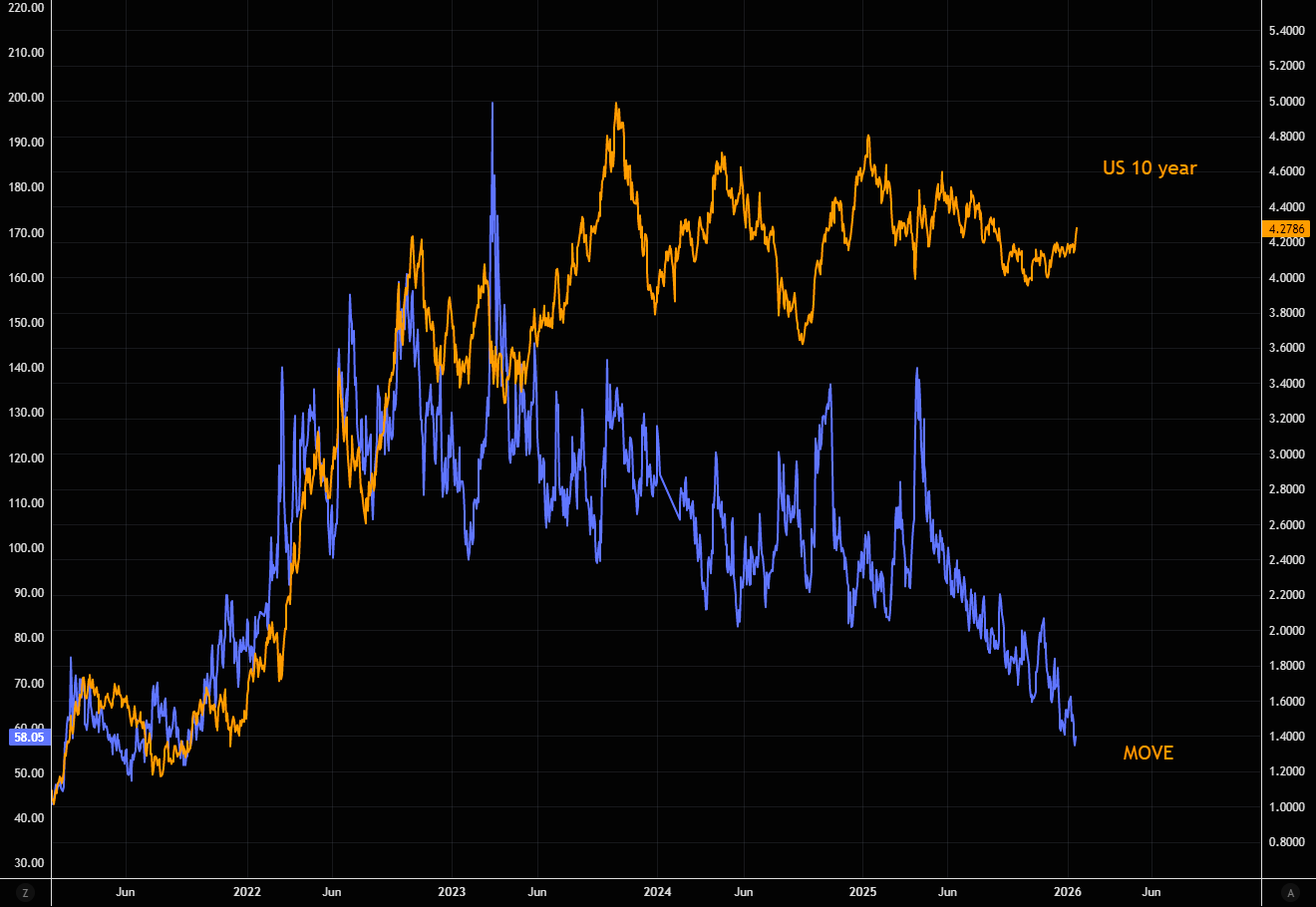 Bond volatility has stayed eerily calm, but if the latest move in rates turns into something more than noise, the MOVE should start catching some serious bids.