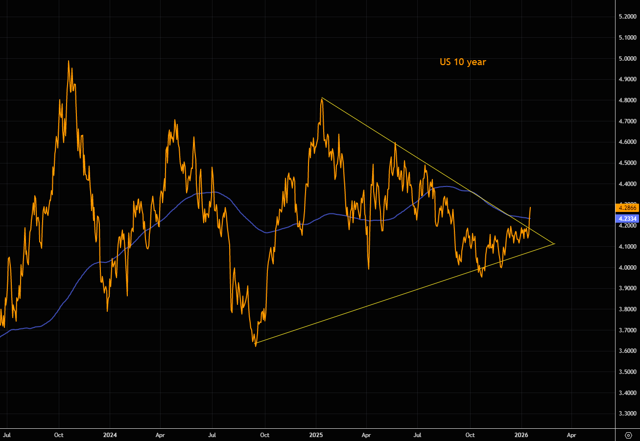 Last week we asked ourselves rhetorically if rates could rise. Since then the US 10 year has shot up higher. We have taken out the triangle like formation, and are trading above the 200 day MA again.
