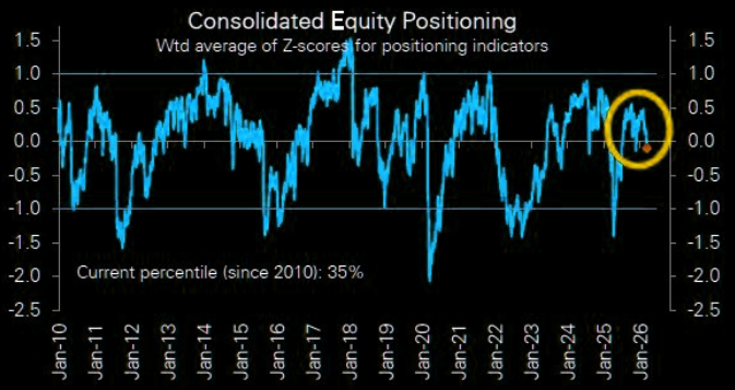 DB: "Our measure of aggregate equity positioning continued to drift lower and is below neutral (-0.10sd, 35th percentile from 38th percentile the prior week)."