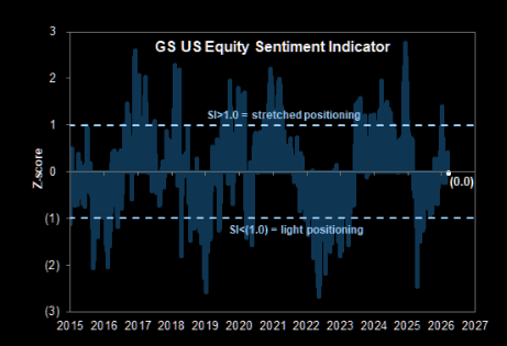 GS US Equity Sentiment Indicator of investor positioning that combines 9 measures of positioning across institutional, retail, and foreign investors is just at a neutral level.