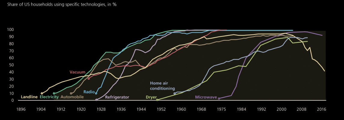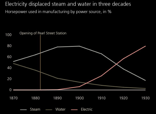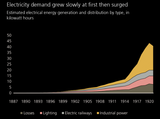 Back then, electricity gave us refrigerators and washing machines. Today it gives us 1.5 billion-parameter LLMs that can barely summarize a PDF without hallucinating. The chart shows how household electricity adoption spurred wave of innovation in appliances.