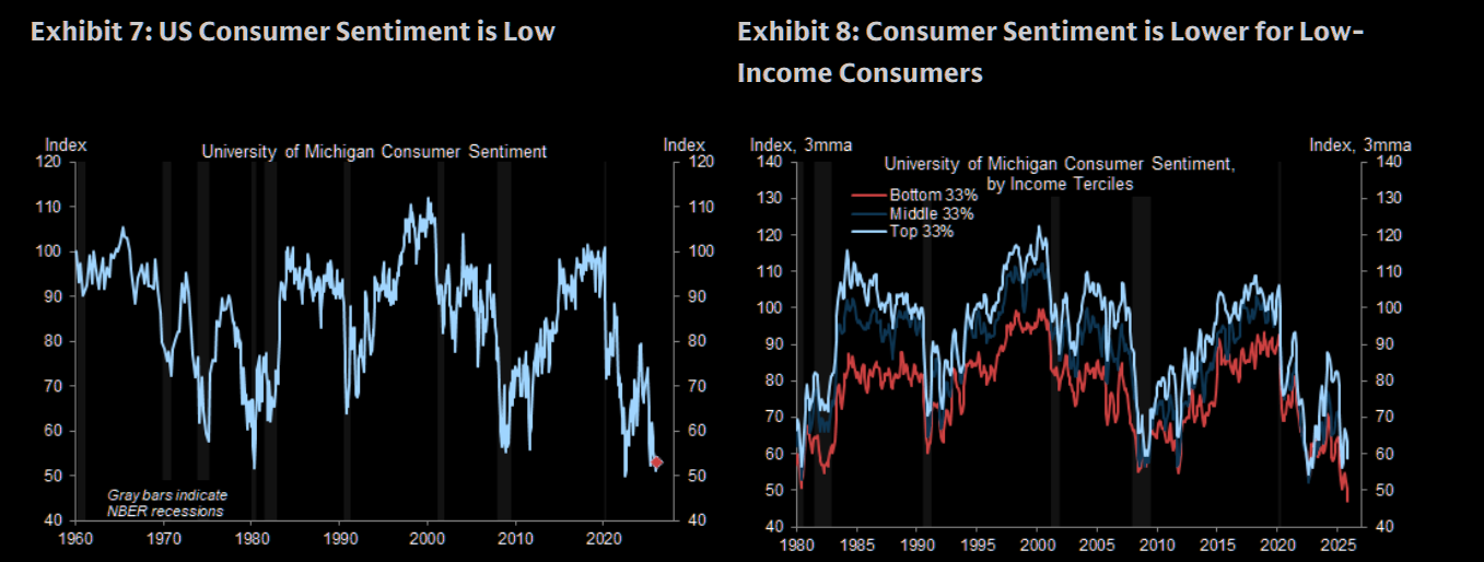 GS: "Consumer confidence remains relatively depressed (relative to historical levels) and remains below GFC levels. Looking more closely, consumer sentiment also remains bifurcated by income and remains elevated for higher-income consumers and more depressed for lower-income cohorts."