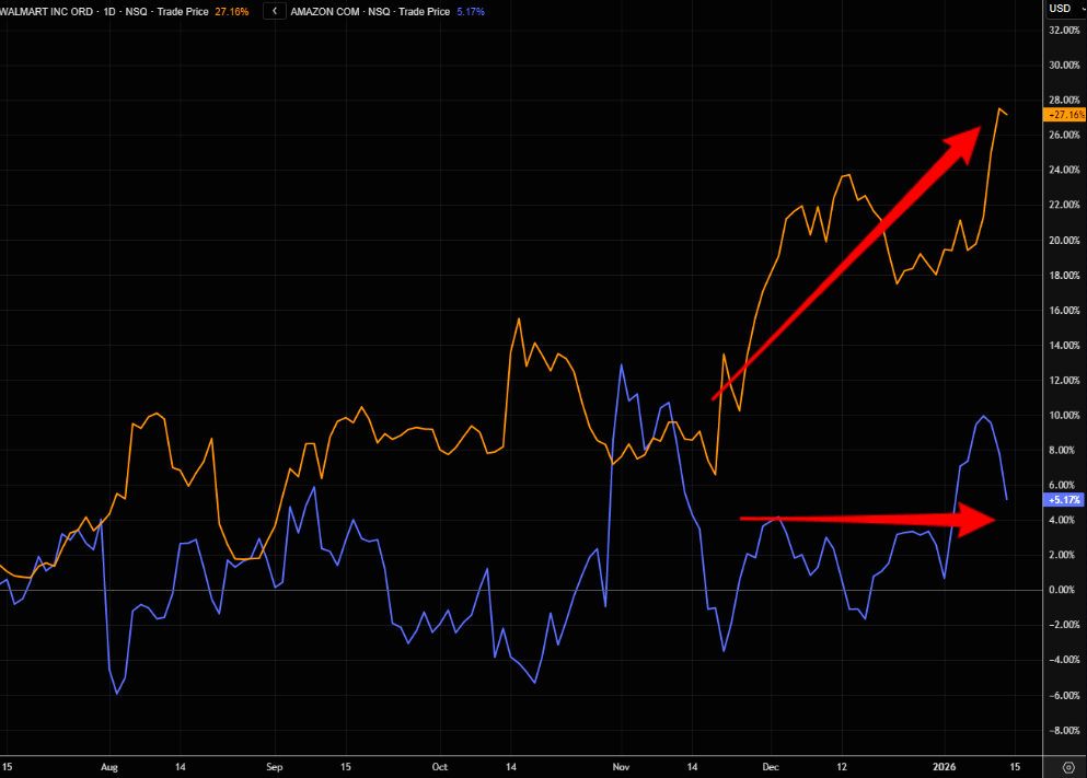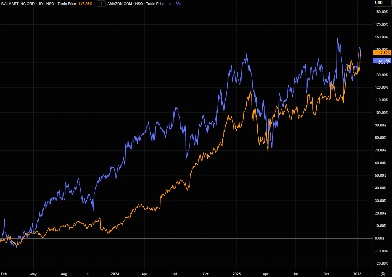 AMZN has basically been flat-lining since late November, while WMT is up some 25%.