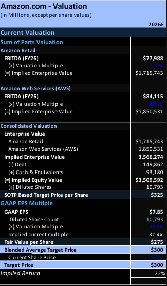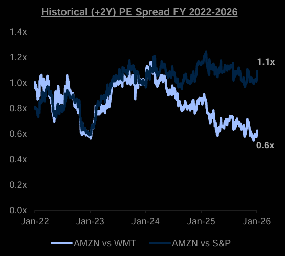 AMZN now trades at >10x discount to retail peer WMT, despite a faster earnings growth profile over 25-27.