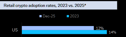 2025: Crypto adoption rate decreased from 24% in January to 18% in December for those aged 18-34, and 22% in January to 15% in December for those aged 35-54.