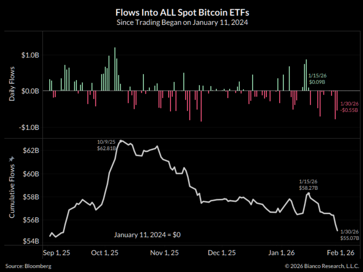 Daily flows into ALL BTC ETFs. Outflows to 10 straight days (last inflow, January 15). New record.