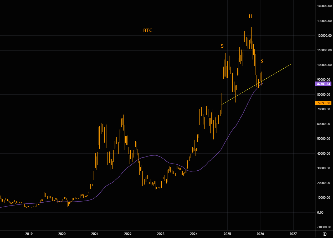 BTC broke below the head-and-shoulders neckline some time ago. If the pattern is valid, there’s still room to the downside. Note that the 100-week MA has now been taken out.