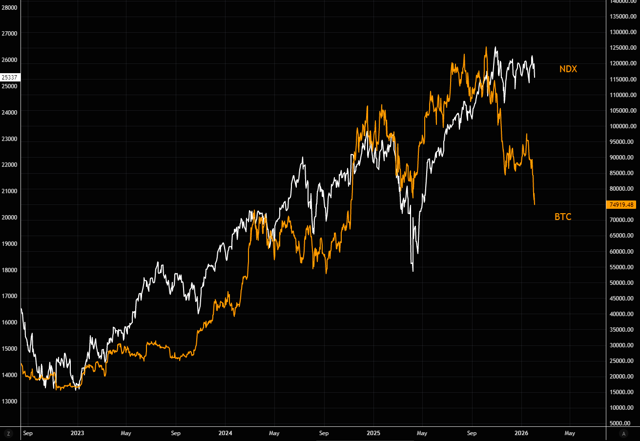 If BTC still captures aggregate market psychology, that widening gap versus NDX should make you uneasy.