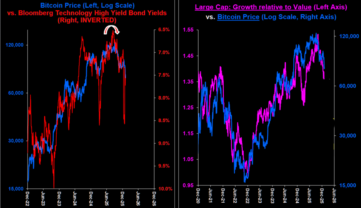 Since mid-year lows, tech credit stress has risen, dragging Bitcoin lower as it trades like a speculative tech asset. Bitcoin also tracks Large Cap Growth relative to Value, making the joint selloff particularly notable.