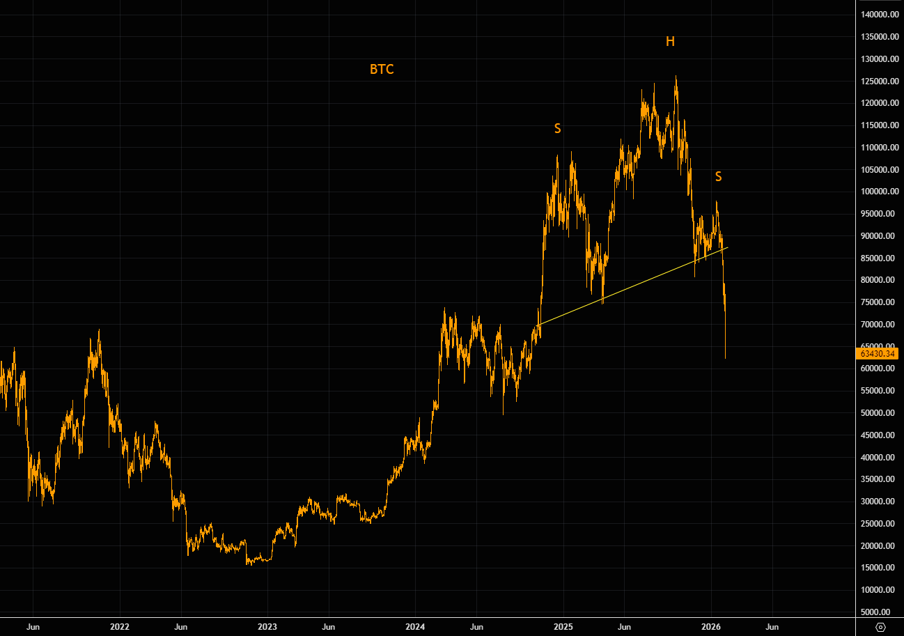 We flagged the massive BTC head-and-shoulders not long ago (here). The neckline break was aggressive and the free fall has picked up speed.