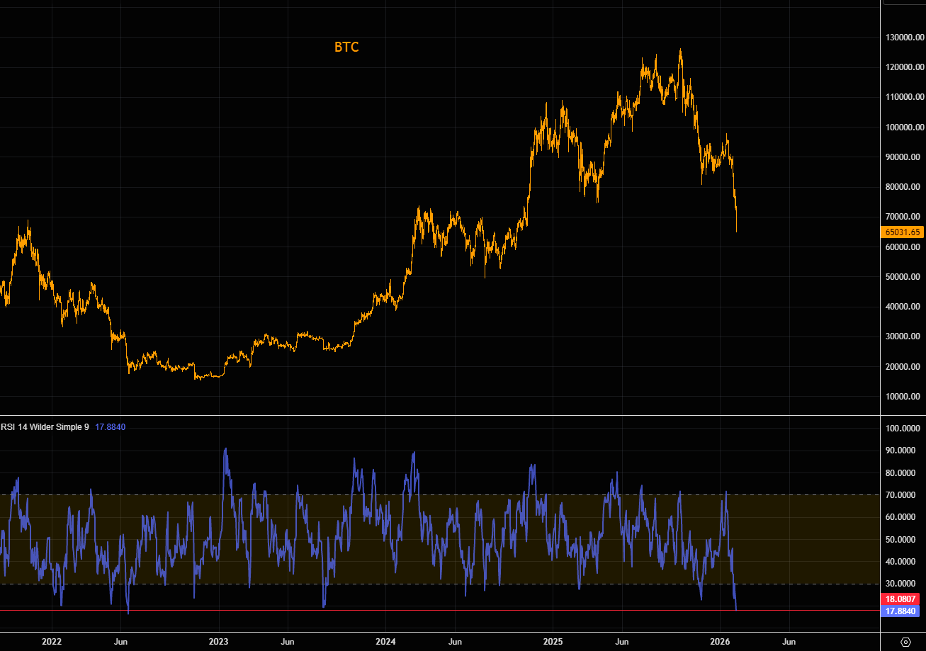Bitcoin RSI at 21.5 earlier today was "bad"... but we are now at 17.9, most oversold since June 2022.
