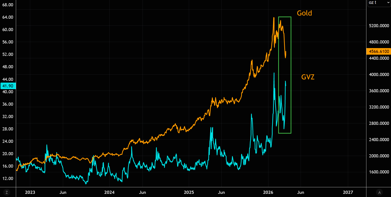 Gold generally exhibits an upside volatility skew, with implied vol increasing during rallies and declining during sell-offs. However, crowded positioning drove a sharp rise in vol on the downside as investors sought protection. Should gold stabilize or move higher, the elevated hedges are likely to decay quickly, creating conditions that could support spot through reallocation flows. Latest gold note here.