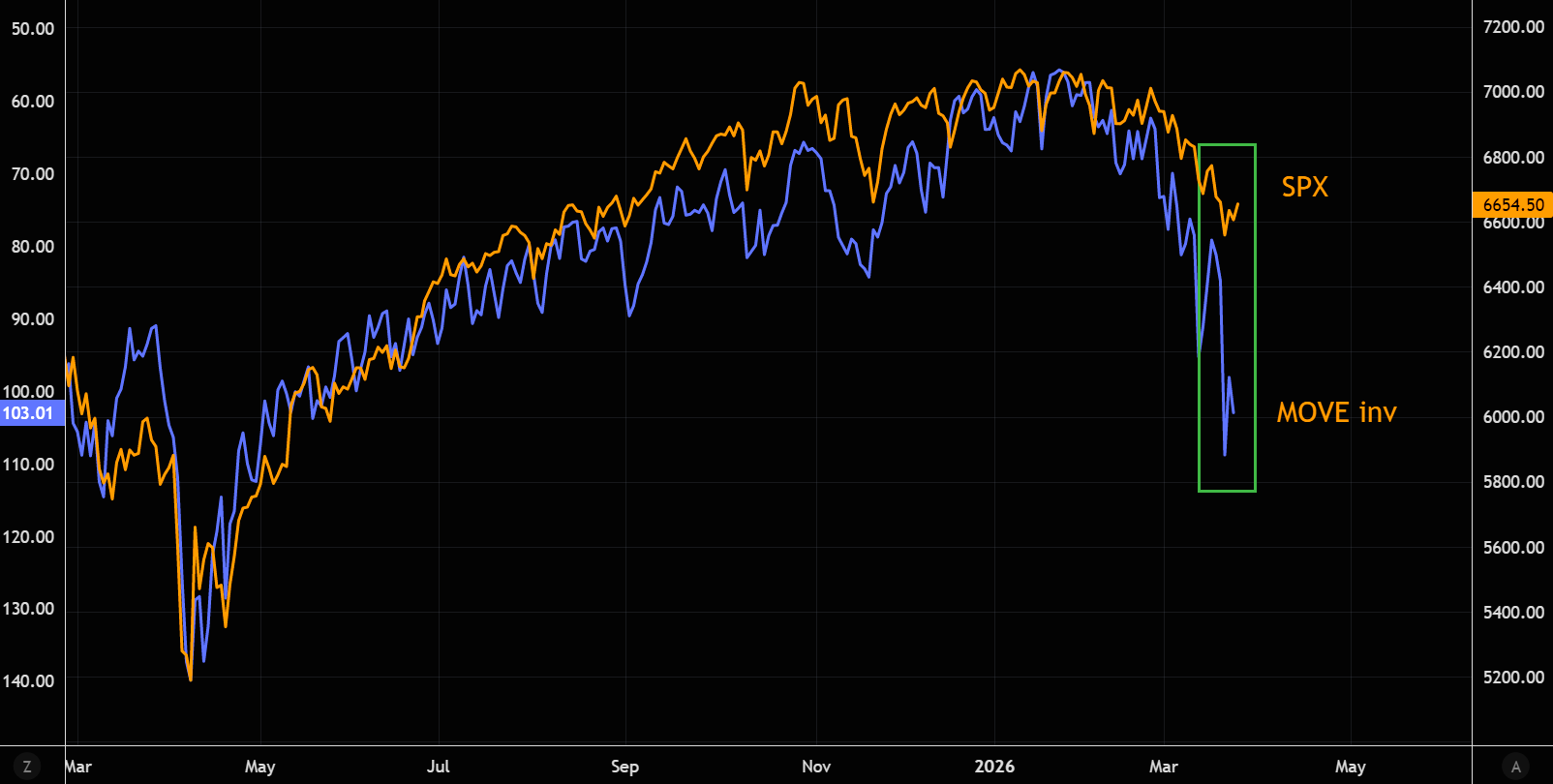 The SPX bounce… or stressed bond markets. The gap between SPX and MOVE (inverted) is wide, and these gaps don’t tend to last. Bonds aren’t buying the bounce. More here.