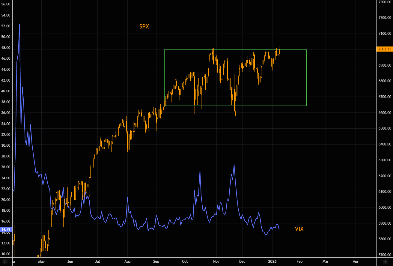 SPX is flirting with range highs, futures closing at ATHs, with VIX sub 15. Ranges demand a mean-reversion mindset, until they don’t. Decision time is approaching, but imploded vol here isn’t rich for directional bets.
