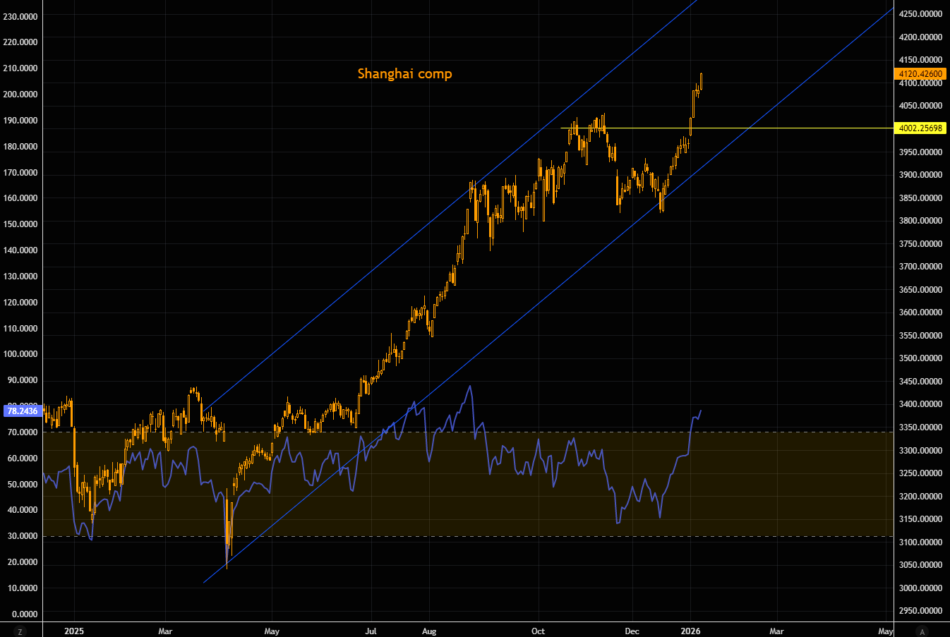 The Shanghai Composite keeps ripping, extending the melt-up. Remarkably, the latest China bull is still barely on the radar (for more see here and here). Even a push toward trend-channel highs implies meaningful upside from here. Yes, RSI is stretched, but overbought has a habit of staying overbought much longer than consensus dares to imagine.