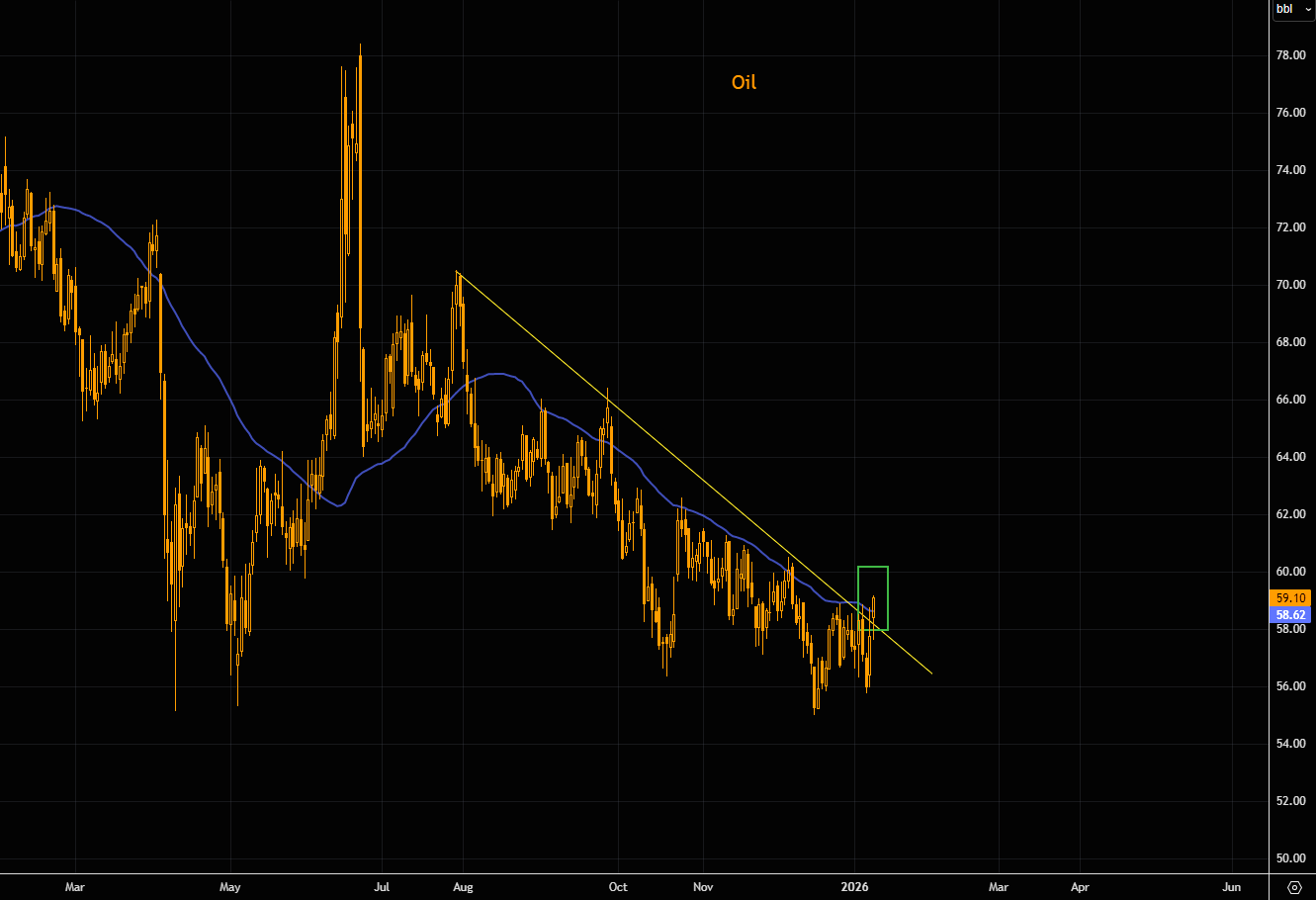 Oil is smashing through the negative trend line. Even more notable, crude is set to close above the 50-day, something we’ve barely seen in recent months.