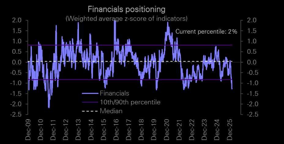 GS Prime’s saying All Financials subsectors were net sold YTD except Regional Banks, with Capital Markets, Financial Services, and Consumer Finance leading … Gross allocation to financials as a % of the global prime book now stands at 12.1% in the 1st percentile in the past year and 8th percentile in the past 5 years. Net allocation to Financials now stands at 11.9%, the lowest level since October 2024, in the 15th percentile over the past five years.