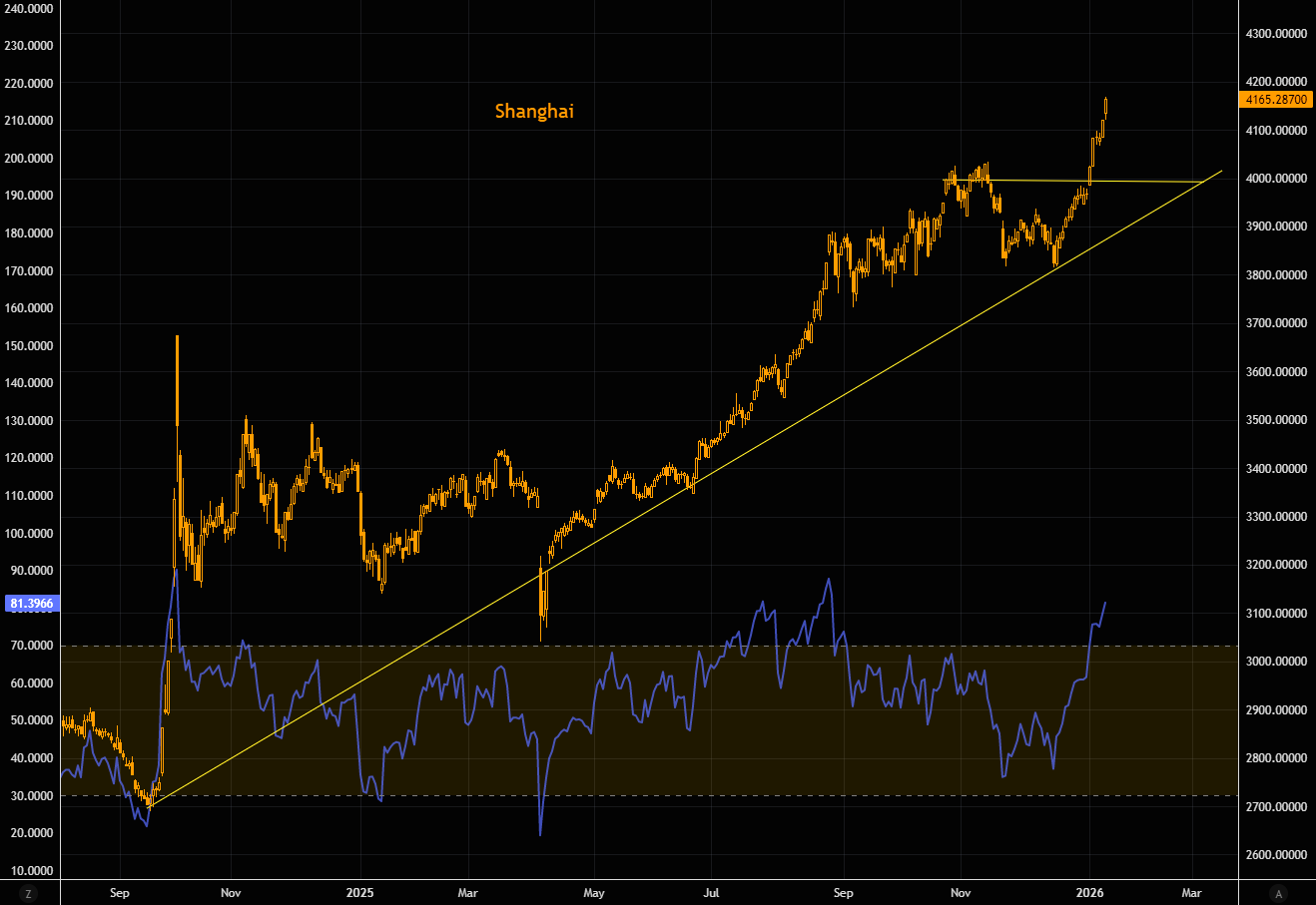 Shanghai is still in full melt-up mode after the textbook breakout. We’ve now gone 17 straight sessions without a single bearish candle. Momentum is undeniable, but with RSI pushing 81, we’re deep into overbought territory, but as we all know, overbought can stay overbought for longer than most think possible.