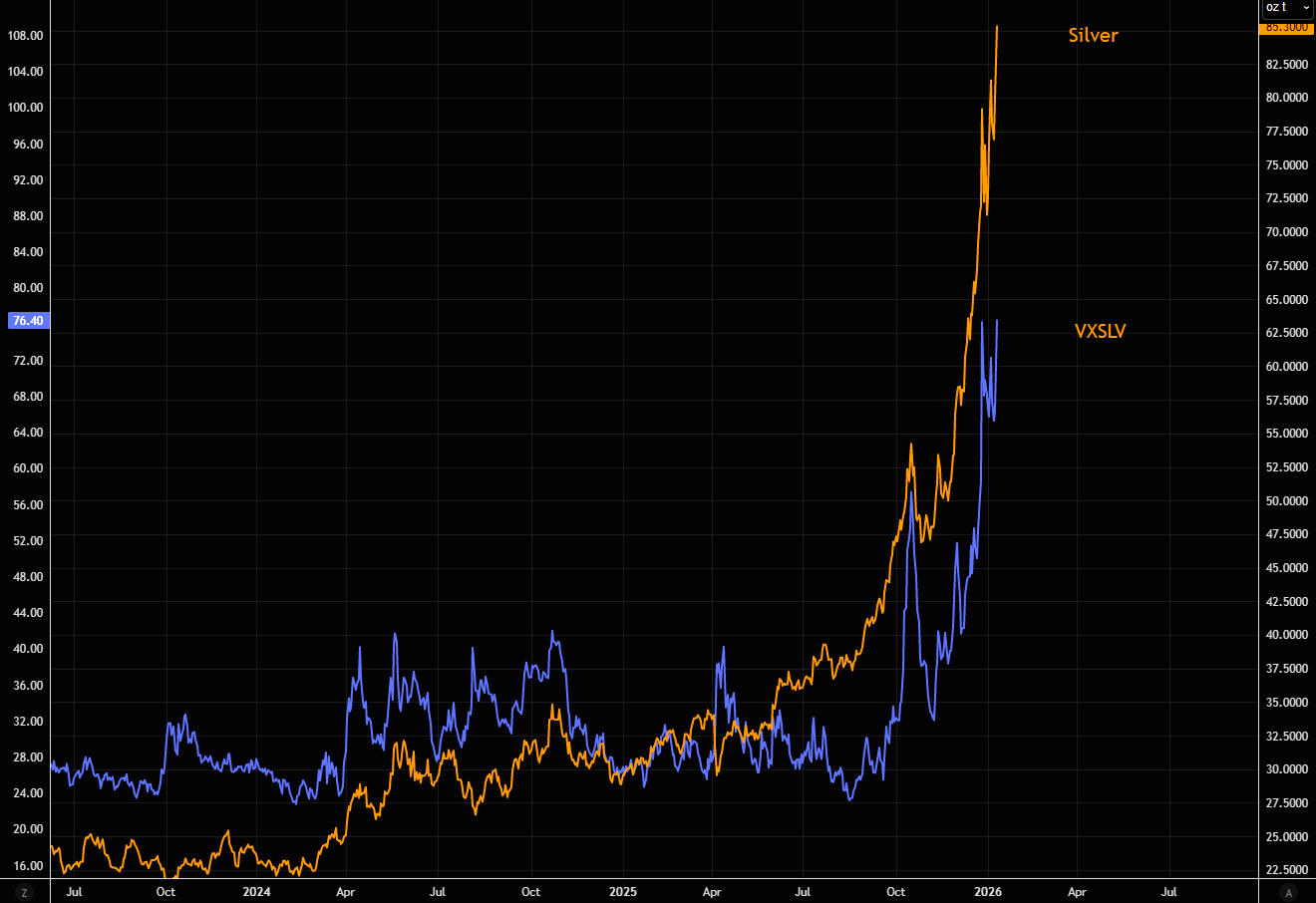 Silver volatility taking out new highs as well. This is pure panic where underexposed investors grab upside optionality in order to show any exposure. Full silver note here.