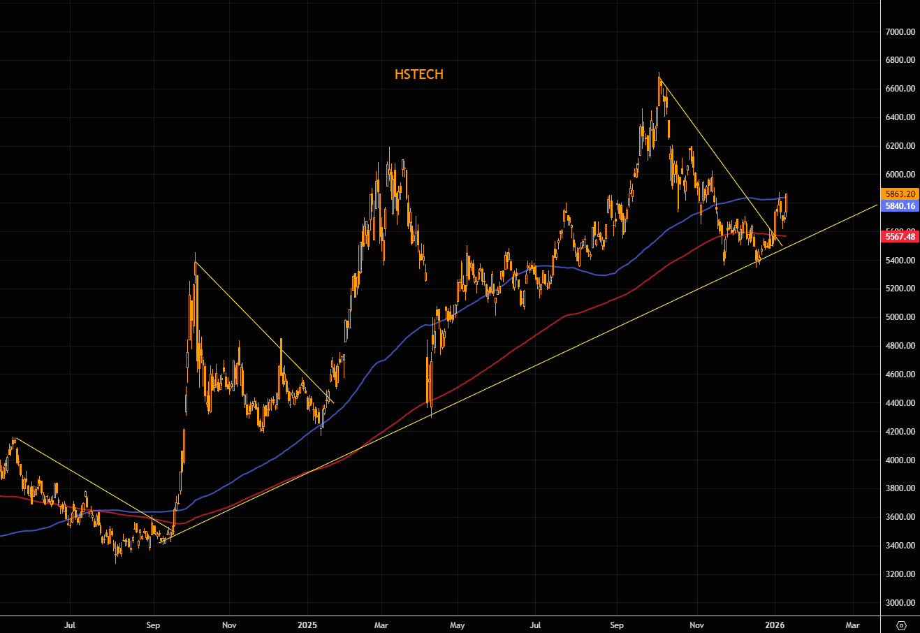 HSTECH is printing a big up candle, up more than 3% on the day. We laid out the bull case recently (here). Note the clean bounce off the longer-term trend line and the 200-day not long ago, and now the decisive push back above the 100-day.