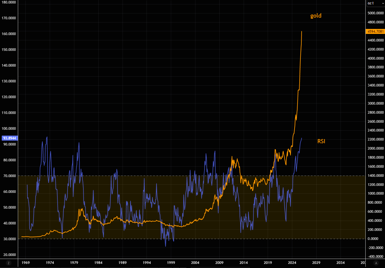 Gold monthly RSI rounded off trades at 94! Nothing for the short term crowd to care about, but this is extreme. Latest read on gold here.