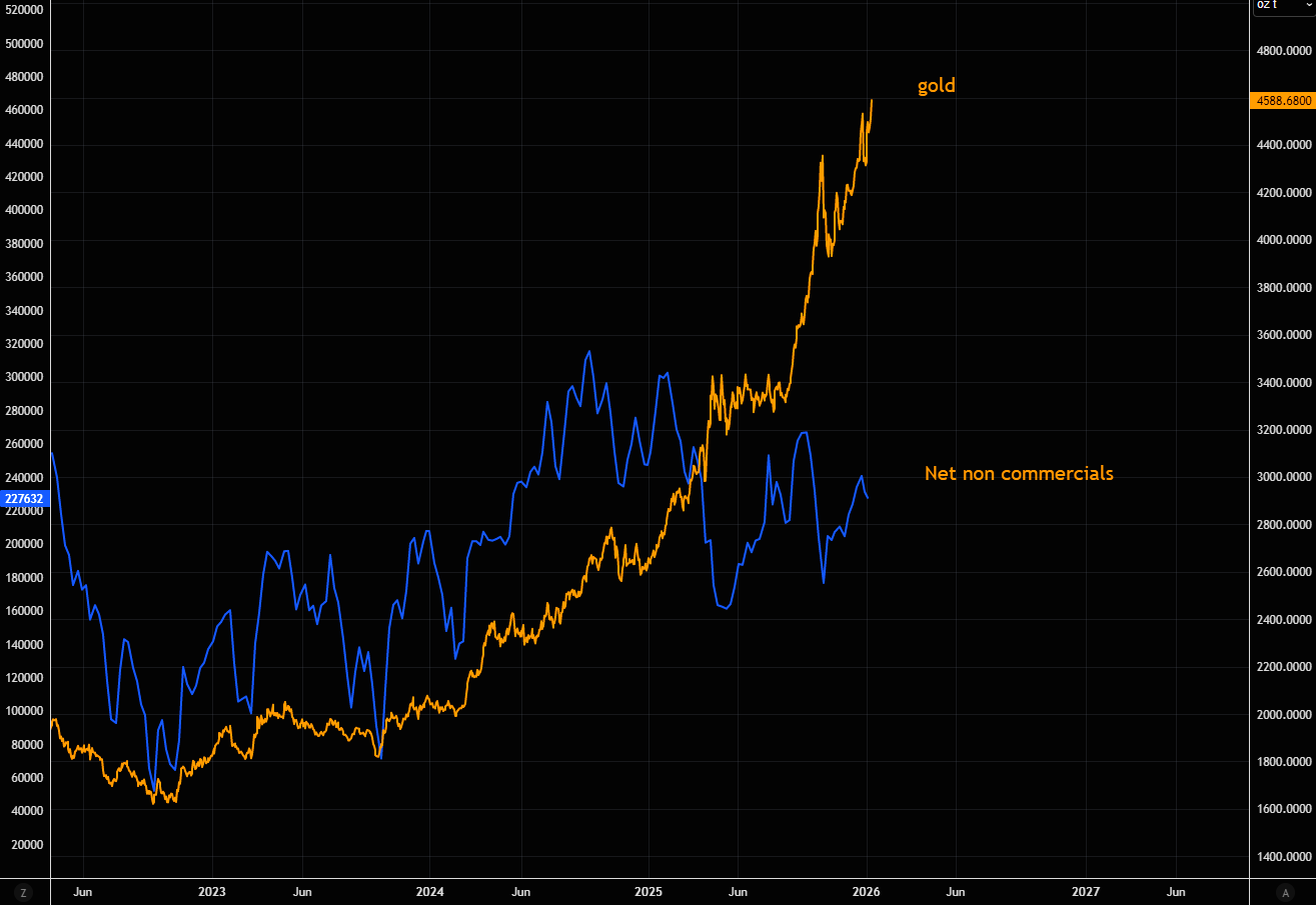 ...step up and increase the long? Gold net non commercials stay stubbornly underexposed to the great gold bull.