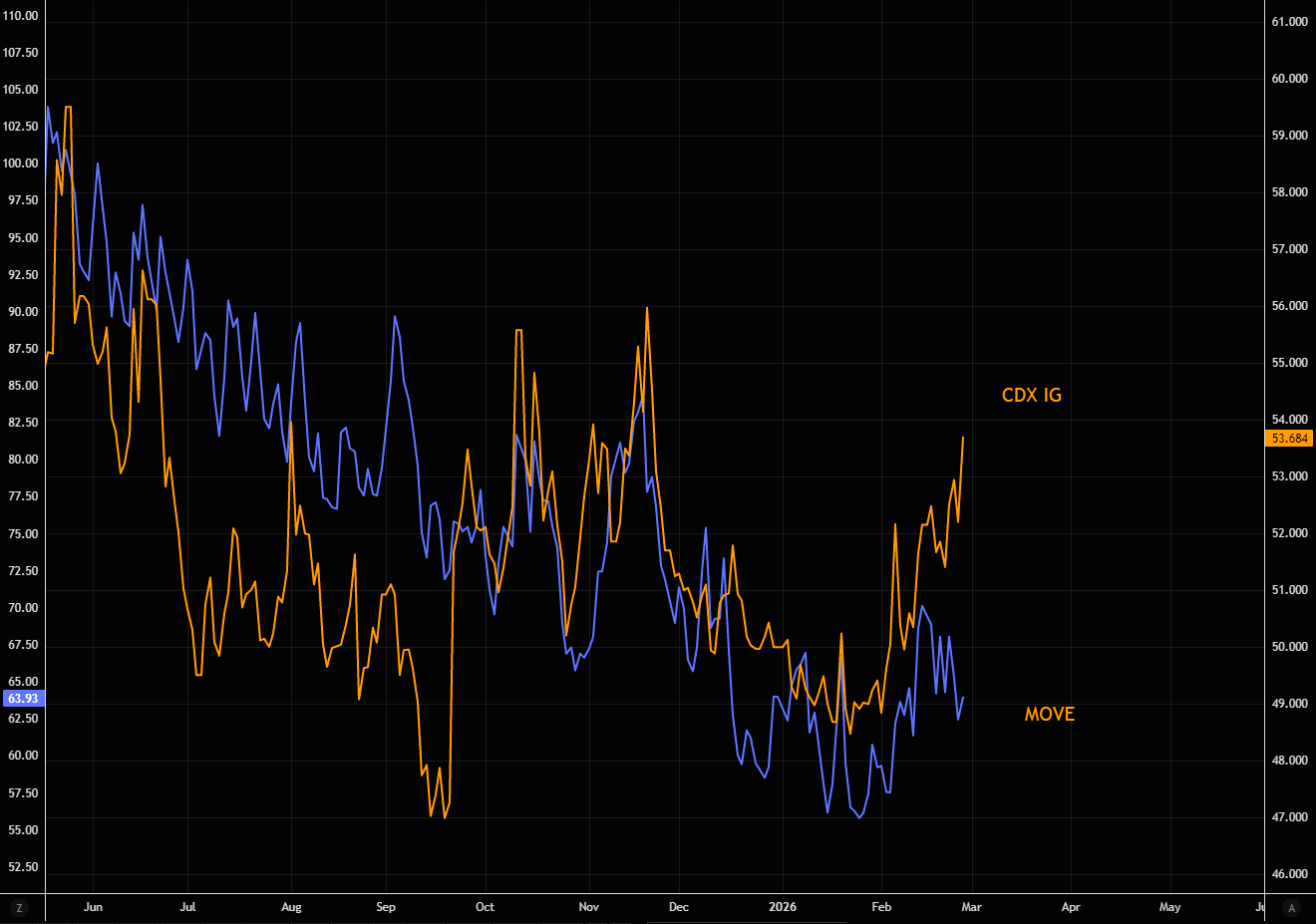 CDX IG and VIX are now moving higher in tandem. Cross-asset risk pricing is starting to re-align.