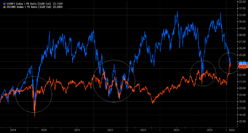 "...the fwd P/E of the Info Tech GICS (blue) is now at par with that of the Staples GICS (orange) – something that typically only happens during ‘market events’ (Liberation Day etc)." Writes GS.