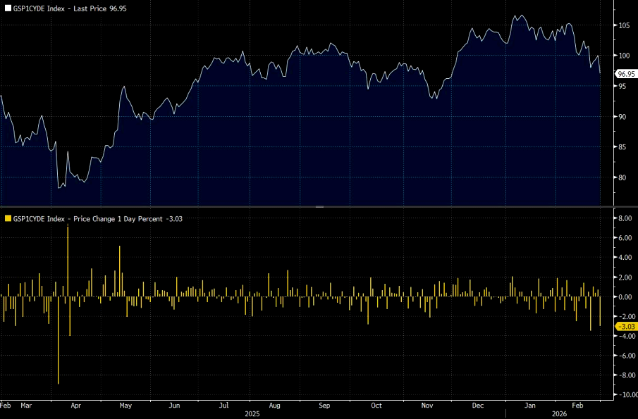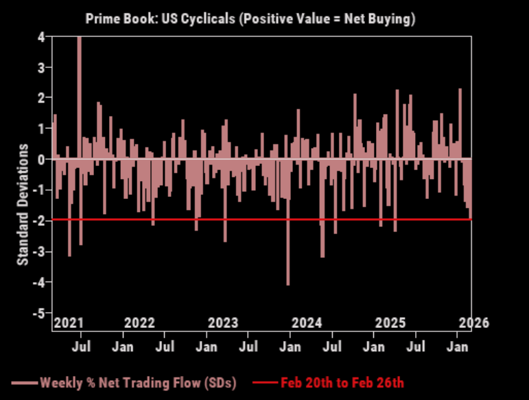 All US cyclical sectors, Energy/Materials/Industrials/Financials/Real Estate – were net sold last week and collectively saw the largest net selling since Liberation Day (-1.9 SDs 5-year), driven by long-and-short sales. US Cyclicals long/short ratio now stands at 1.79 (vs. YTD high of 1.89 seen in late January), in the 54th/45th percentiles vs. the past year/five years.