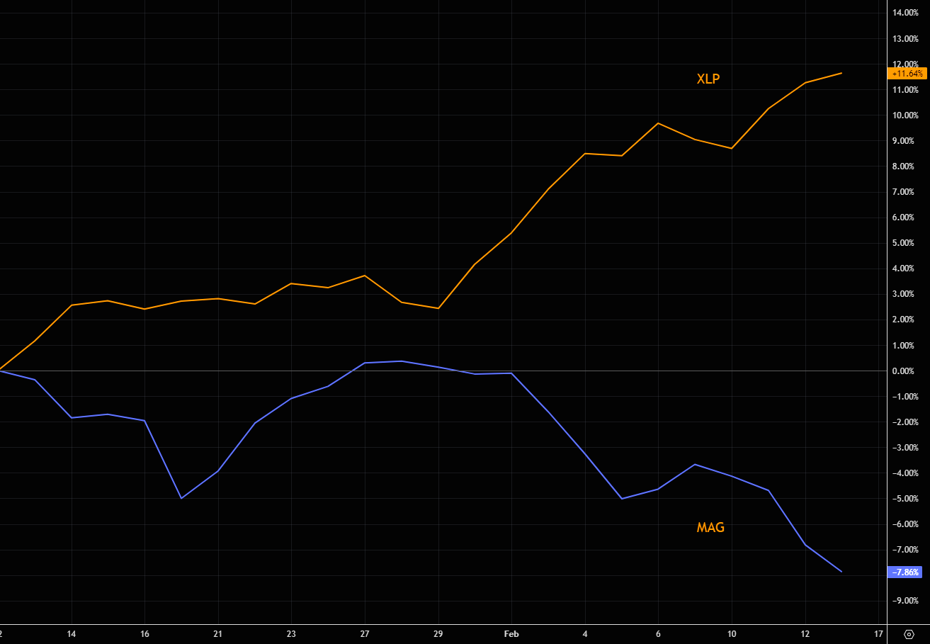 The YTD tale of the tape between XLP and the “MAG 7” needs little commentary, defensives are quietly winning while the former leaders struggle to keep their footing.