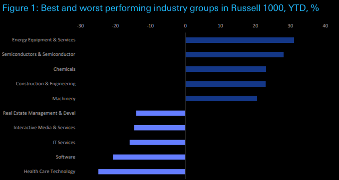 3. In the Russell 1000 this year, energy equipment and semiconductors are up ~30%, while software and healthcare tech are down more than 20%. (DB)