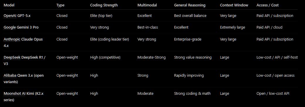 Table shows top 3 closed vs open (Chinese) models. Closed models still lead the absolute frontier, particularly in multimodal capability and deep reasoning. Open-weight models are now highly competitive in coding and cost-efficiency, with the main gap increasingly about deployment flexibility and price rather than raw performance.