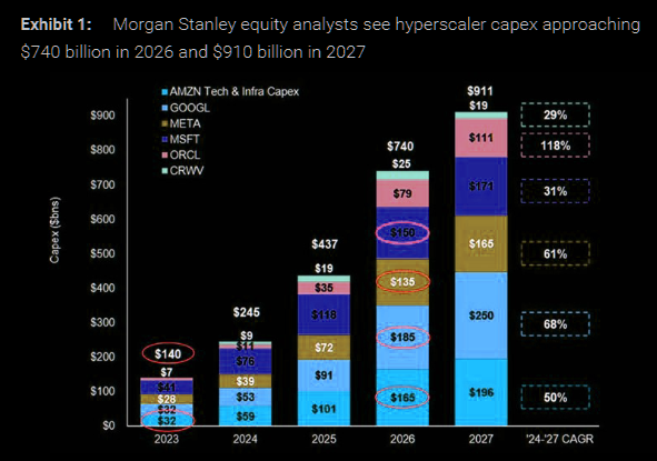 2. Capex is exploding, with hyperscalers potentially spending $700bn+ on AI data centres this year and trillions by decade-end, increasingly funded not just by cash flow, but by rising debt issuance.