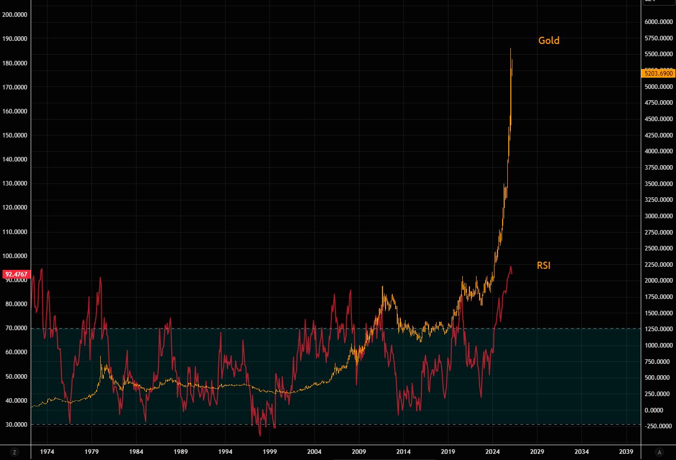Gold’s monthly RSI has cooled marginally, but at 92 it still screams momentum excess.