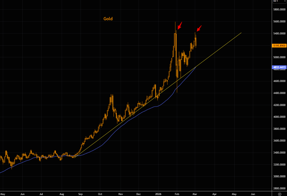 The steep trend line sits well below current levels, and the 50-day moving average doesn’t come in until around $4,830.