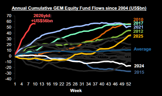 Global emerging market funds are buying EM equities at the fastest annual pace in two decades.