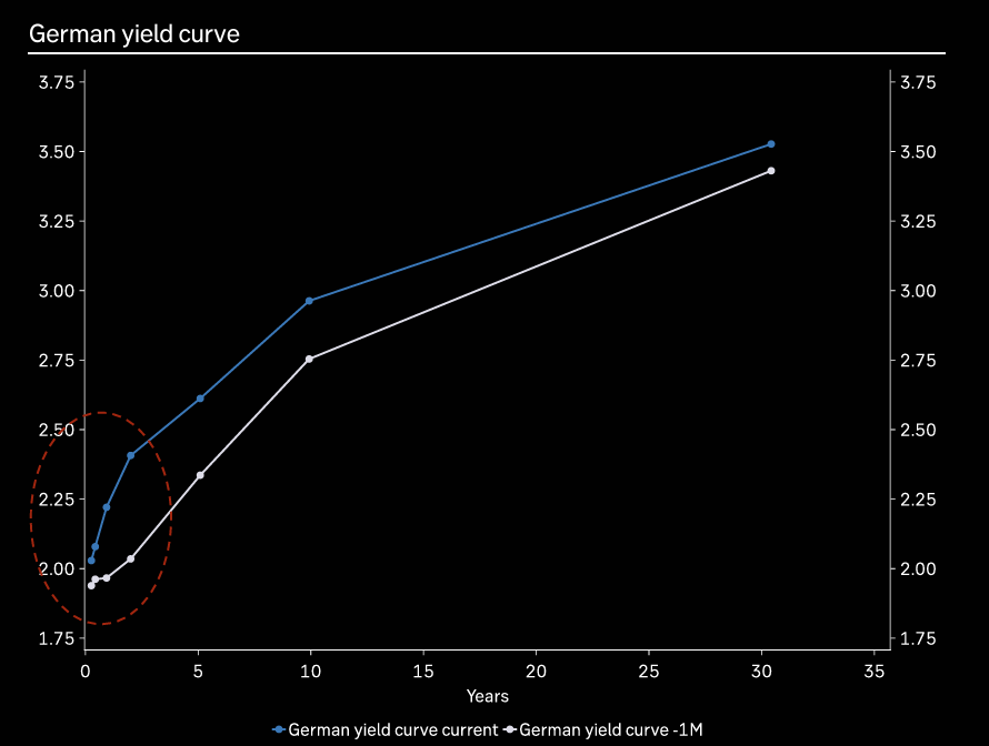 European 0-2 year yield curve steepens sharply, while the 2-30 year curve flattens.