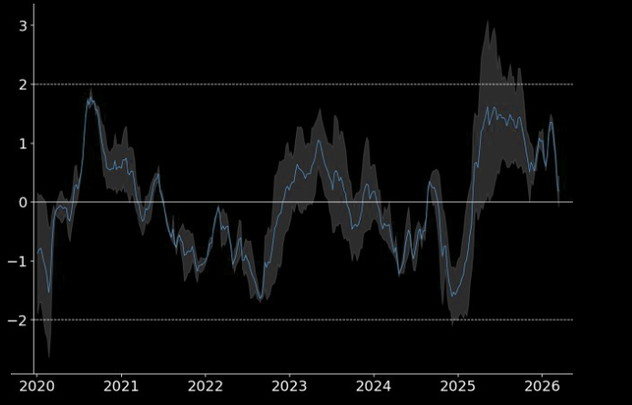 Aggregate EUR/USD positioning proxies back almost fully to neutral. Chart shows JPM FX avg of EUR/USD futures positioning & options flows (10wk rolling, calls vs. puts). Z-score and range.