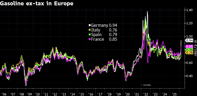 In Germany, petrol prices have reacted much more sharply to the oil shock than in the rest of Europe. Excluding taxes and duties, petrol currently costs about 94 cents per litre at the pump in Germany, compared with 85 cents in France, 79 cents in Spain, and 76 cents in Italy.