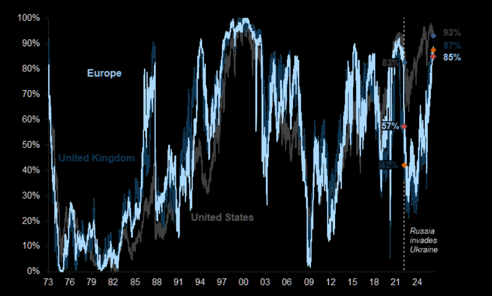 Europe is trading at the 84th percentile of its historical valuation range. Not cheap vs. history...