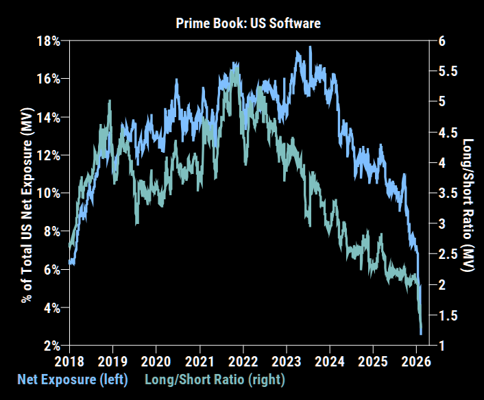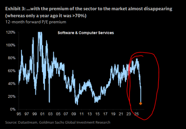One year ago software traded at a 70% P/E premium to the market. Now it is almost completely gone.