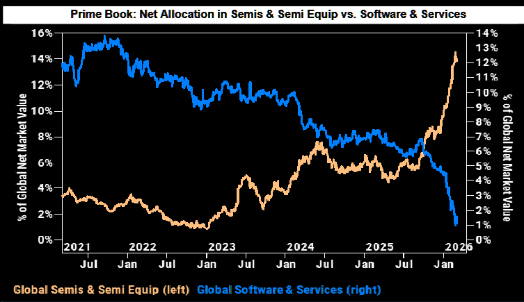 Software and Semis & Semi Equipment were by far the most net bought during the week. Net buying in Software was mainly driven by short covering in the US, while Semis and Semi Equipment saw inflows from both new long positions and short covers. Plenty of chasing potential in software if investors start going long the space. More on software here.