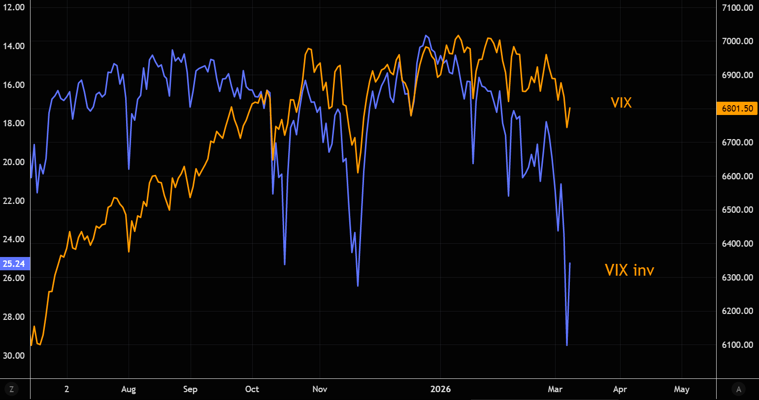 The crowd tends to forget that volatility is mean reverting. VIX printed a huge intraday reversal, although the gap versus SPX still remains relatively wide. Chart shows SPX vs VIX.